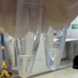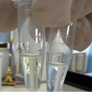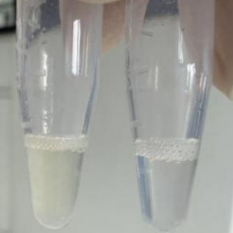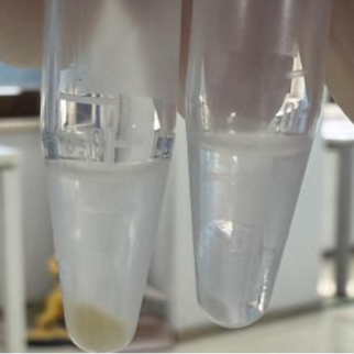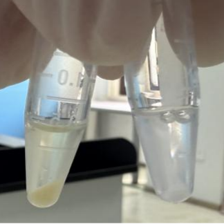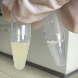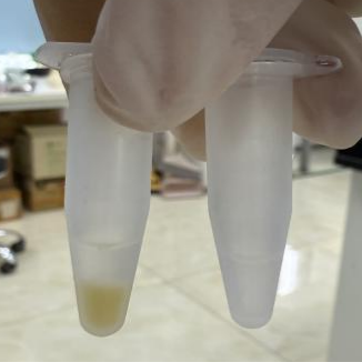 圖片中左側為細胞數量是2×106個數的CHO-S細胞(黃色細胞沉淀);圖片右側為細胞數量1×105個數的Raw(白色細胞沉淀),作為反面對照,細胞個頭較小,數量太少,對后續提出的蛋白濃度以及核漿分離結果有較大的影響。