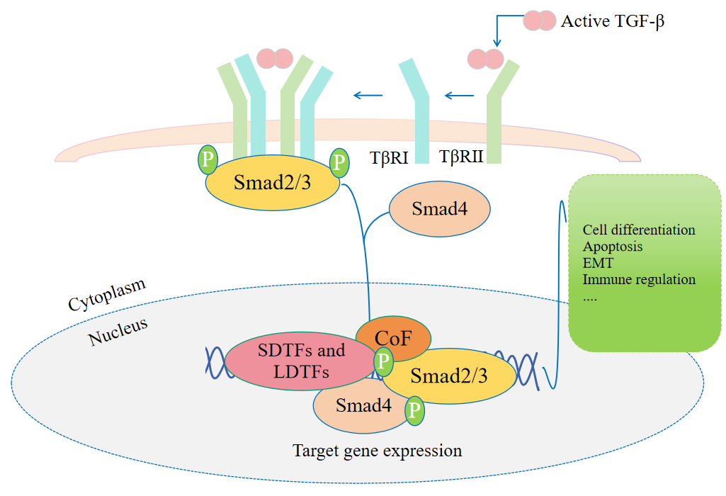 TGF-β的經典信號通路主要為受體依賴性R-Smad磷酸化的分子級聯反應。該信號轉導系統根據受體類型可分為:TGF-β1/2/3通路以及BMP通路。TGF-β1/2/3與BMP信號來源分別特異性激活Smad2/3和Smad1/5/8信號軸。其中TGF-β1/2/3激活典型的TGF-β通路受體,受體系統包含功能特化的三類跨膜蛋白:具有絲氨酸/蘇氨酸激酶活性的Ⅰ型受體(TβRⅠ/ALK5)、Ⅱ型受體(TβRⅡ)和Ⅲ型受體(TβRⅢ/betalycan)。經典TGF-β信號傳導中,配體首先通過結構特異性識別與TβRⅡ結合,誘導受體寡聚化并招募TβRⅠ形成異源四聚體復合物。TβRⅡ通過跨膜磷酸化級聯激活TβRⅠ的激酶結構域,進而催化Smad2/3末端基序的絲氨酸殘基雙磷酸化。這一翻譯后修飾觸發R-Smad的構象重排,使其脫離受體復合物并與SDTFs、LDTFs、Smad4及CoF等因子于細胞核內形成多聚體轉運復合體,進而調節靶基因表達。TGF-β調控多種基因表達,從而引發細胞分化、凋亡、上皮-間質轉化(EMT)以及免疫調節等生物學過程[17-18]。